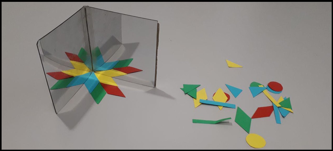 Els hi demanem que col·loquin el llibre en un angle de 90° i hi posem la peça al mig. Quantes vegades s’ha repetit la imatge? Poden veure que la peça que han posat es repeteix 4 vegades.